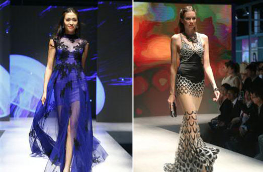 海之秘境,犹如一幅深邃的画面,神秘而又浓烈。本系列的色调运用成熟且大胆,展现出设计师们的多变风格。随着水纹蓄势待发汇聚成海,厚重的水纹线条肆意延伸,浓烈色调让人感受到大海的力量。深蓝色亮片系列运用半透明的面料,神秘感十足,在层叠组合间丰富地点缀着高级亮片及水钻配饰,精雕细琢的高超手工艺更打造出梦幻浪漫的气息,飘渺的海生植物,灵异的奇花异卉,深海的水生藤蔓,秘境中奇妙的自然元素在设计师手中也变的更为有趣和出彩。在模特身上,我们看到了充满原始感的植物线条,似真似假地随波荡漾,光与影的交错重叠,浓与淡的色彩游戏,深浅相宜的传递出海之秘境的浓重与内涵,奢华的金丝在飘逸轻薄的面料上交织出精致的纹路或立体的图案,幻影迷离中展现着这一系列的魅惑性感,却又与高贵端庄兼得,让人美不胜收。